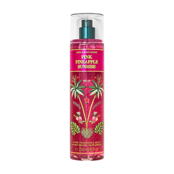 Bath & Body Works Pink Pineapple Sunrise Body Mist يتفتح بعطر استوائي مشرق يشبه شروق شمسٍ وردي فوق نخيل هادئ، حيث يلمع الأناناس العصيري الحلو منذ اللحظة الأولى ليمنح العطر فاكهية دافئة ومضيئة. ثم تظهر لمسة خفيفة من سكر النخيل تضيف نعومة حلوة أقرب لسكّر الحلوى، بينما ينساب رحيق استوائي دافئ ليمنح العطر عمقًا شمسيًا خفيفًا بطابع شرابي لطيف. النتيجة رذاذ فاكهي–سكّري مرح، صيفي، ومفعم بإحساس العطلات وكأنك تسترخين تحت نخلة أو تحتسين شراب الأناناس في أجواء دافئة.