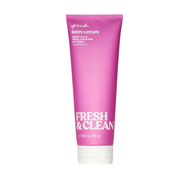 VICTORIA'S SECRET PINK BODY LOTION FRESH & CLEAN يستقر على البشرة بخفة منعشة ونابضة، جامعًا بين قوامه الحريري الناعم ورائحته الزاهية التي تمنح إحساسًا يشبه ملامسة نسيم صباح بارد. يمتصه الجلد سريعًا، مما يخفف الجفاف ويترك البشرة ناعمة، ملساء، ومُرطّبة براحة، بينما تبقى رائحته النظيفة والمبهجة — مزيج من التفاح الطازج ونفحات ندية شفافة — عالقة برقة في الخلفية. النتيجة لوشن هوائي لطيف يمنح ترطيبًا ثابتًا ويلف البشرة بإحساس انتعاش ناعم يشبه نظافة ما بعد الاستحمام، يرافقك طوال اليوم بهدوء وخفة.