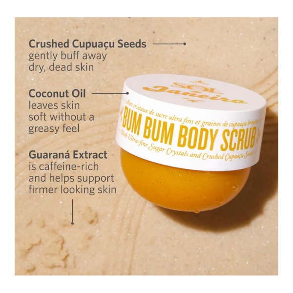 مقشّر Sol De Janeiro Bum Bum Body Scrub ينساب على البشرة بدفء غني يشبه لمسة الشمس، فيما يعمل مزيج حبيبات الكوبواسو المطحونة والبلورات السكرية الدقيقة على تنعيم البشرة بلطف وإزالة الخشونة، منصهراً في قوام كريمي مغذٍ يترك البشرة ناعمة بشكل لا يُقاوَم؛ وبفضل رائحة Cheirosa 62 الشهيرة والممزوجة بنفحات الكراميل المالح والفستق والفانيلا الدافئة، يلفّ الجسم بعطر استوائي فاخر يكشف عن بشرة أكثر نعومة وإشراقاً وحيوية، بلمسة ترفٍ دافئة ومبهجة ومتلألئة بالجمال.