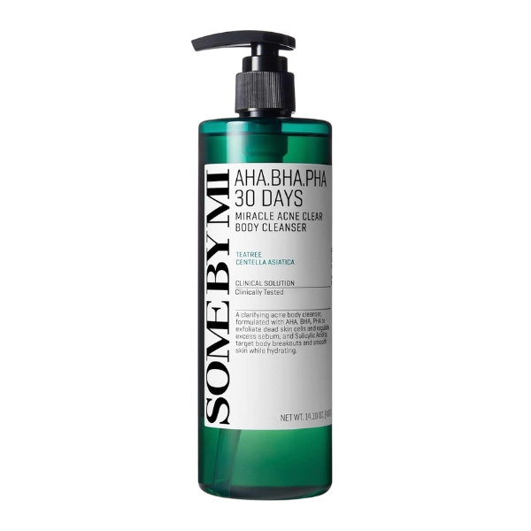 Some By Mi 30 Days Body Cleanser هو غسول علاجي موجه لعلاج حبوب الجسم والخشونة وعدم تجانس ملمس البشرة في مناطق مثل الظهر والصدر وغيرها. تكمن فعاليته في مزيج متوازن من الأحماض المقشرة AHA وBHA وPHA التي تساعد على تنظيف المسام بعمق، إذ تذيب الخلايا الميتة وتنعّم ملمس البشرة وتخفف من مظهر ما يُعرف بجلد الدجاج (Keratosis Pilaris). يحتوي كذلك على سنتيلا أسياتيكا وماء شجرة الشاي لتهدئة التهيج ومنع الجفاف، مما يجعل عملية التقشير فعّالة دون قسوة. ومع الاستخدام المنتظم، يساعد هذا الغسول في تقليل الحبوب الموجودة، منع ظهور الجديدة، ومنح بشرة الجسم مظهرًا أكثر نعومة، نقاءً، وملمسًا متجانسًا.
