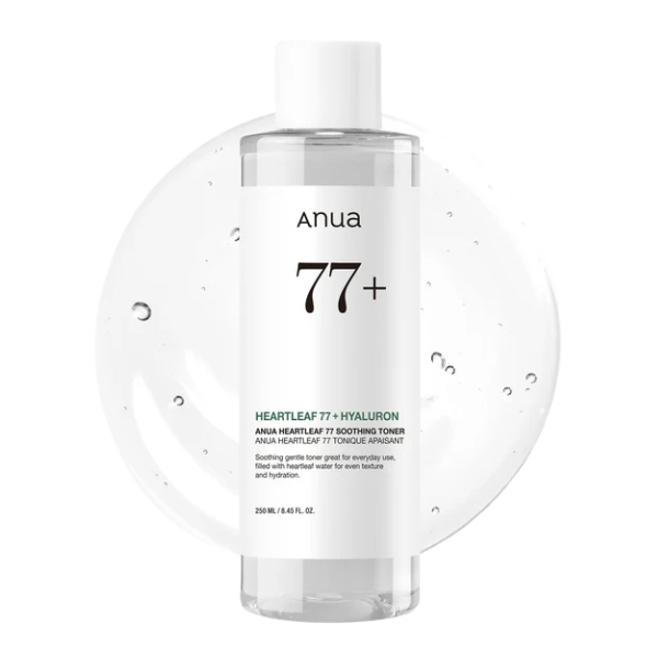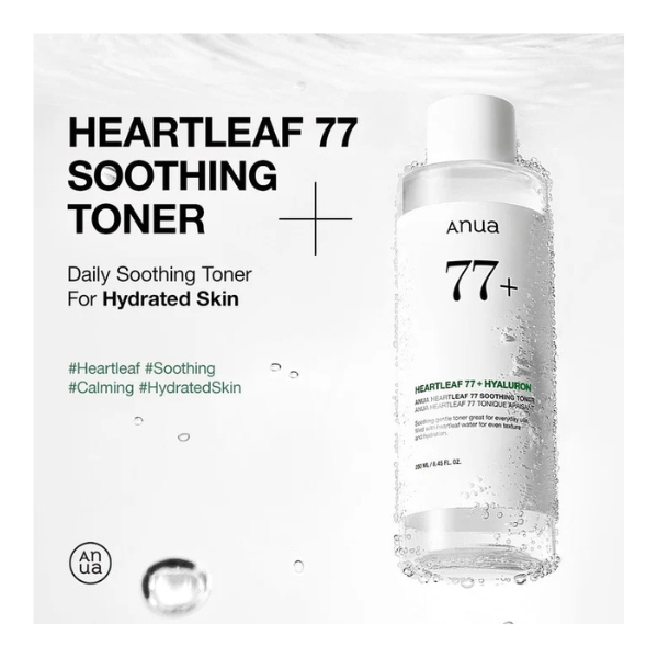 المنتج هو تونر كوري مشهور Anua Heartleaf 77% Soothing Toner، مصمم خصيصًا لتهدئة وموازنة البشرة الحساسة والمتهيجة والمعرضة لحب الشباب. المكون الرئيسي هو 77٪ من خلاصة Houttuynia Cordata (ورق القلب)، المعروف بخصائصه القوية المضادة للالتهابات والبكتيريا والمهدئة. يتميز التونر بخفة قوامه المائي قليل اللزوجة الذي يمنح ترطيبًا فوريًا مع تقليل الاحمرار، وتهدئة البثور، وتقوية حاجز البشرة. خالٍ من الزيوت الأساسية والمهيجات القاسية، مما يجعله تونر لطيف ومثالي للاستخدام اليومي للحفاظ على بشرة صافية، مريحة، ومقاومة، ويُعد عنصرًا أساسيًا في روتين العناية المهدئ بالبشرة.