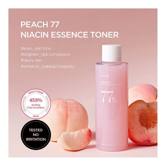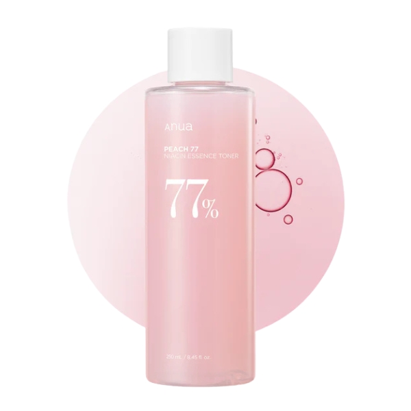 يُعد Anua – Peach 77% Niacin Essence Toner تونر علاجي متعدد المهام صُمم ليُساهم في تفتيح البشرة، ترطيبها وتحسين ملمسها. يرتكز في تركيبته على تركيز عالٍ بنسبة 77% من مستخلص الخوخ الغني بالفيتامينات والأحماض الفاكهية الطبيعية (AHA) التي توفر تقشيرًا لطيفًا يساعد على تنعيم البشرة وصقل سطحها. كما يحتوي على 5% من النياسيناميد (فيتامين B3) الذي يعمل على تقليل التصبغات، تضييق مظهر المسام، وتنظيم إفراز الدهون. يتميز بقوام خفيف قليل اللزوجة يمتص بسرعة، مما يمنح البشرة ترطيبًا فوريًا ويساعد مع الاستخدام المستمر على توحيد لون البشرة ومنحها مظهرًا صافياً، مشرقًا، ونضرًا بشكل طبيعي.