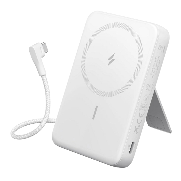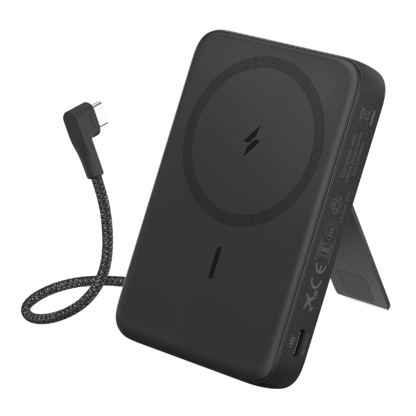 كما يوفر البنك شحنًا لاسلكيًا بقوة 7.5 واط مع محاذاة مغناطيسية، مما يضمن اتصالًا آمنًا لهواتف iPhone المتوافقة مع تقنية MagSafe. يتضمن حاملًا قابلًا للتعديل لزوايا مشاهدة متعددة، مما يعزز سهولة الاستخدام أثناء الشحن. يتميز تصميم الكابل الزاوي المريح بمتانة عالية، حيث تم اختباره لتحمل أكثر من 10,000 ثني. بينما لا يدعم الشحن المعتمد على شهادة MagSafe، فإن قدراته القوية والفعالة في الشحن السلكي واللاسلكي تجعله رفيقًا مثاليًا للمحترفين والمسافرين وعشاق التكنولوجيا.