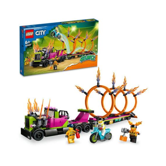 تقدم مجموعة ليغو سيتي شاحنة الحركات البهلوانية وتحدي دوائر النيران 60357 تجربة مليئة بالإثارة لصغار محبّي العروض البهلوانية. تتضمن هذه المجموعة التي تضم 479 قطعة، والمناسبة للأعمار من 6 سنوات فما فوق، شاحنة قوية مزودة بتفاصيل زخرفية وغطاء عادم بخلفيات لهب، مقطورة تحمل منصة انطلاق قابلة للطي، ثلاث حلقات نارية قابلة للتعديل يمكن للدراجة البهلوانية إطلاق نفسها من خلالها، ودراجة تعمل بتقنية العجلة الدوَّارة (flywheel) للانطلاق العالي. كما تشمل المجموعة ثلاث شخصيات ميني فيغ لتمثيل عرض الحركات وتنفيذ السيناريوهات المثيرة. يستطيع الأطفال إعداد المنحدر، وضبط الحلقات النارية بمسافات مختلفة، وإطلاق الدراجة لرؤية مدى السير والانطلاق — مما يساعدهم على التمرّن على التوقيت، الدقة، وسرد القصص. تشجع هذه المجموعة على التنسيق، الإبداع، وإعادة اللعب المتكررة بفضل ميكانيكيات الحركات التفاعلية.