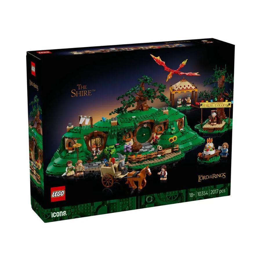 مجموعة ليغو أيقونات: سيد الخواتم - ذا شاير 10354 هي مجموعة مفصلة مصممة لعشاق ليغو البالغين من عمر 18 سنة فما فوق، وتحتوي على 2,017 قطعة. تعيد هذه المجموعة إنشاء منزل بيلبو باغينز الشهير، باج إند، مع تفاصيل دقيقة لداخل المنزل ومناظر شاير الخضراء. تشمل المجموعة الباب المستدير الشهير، الغرف المفروشة، وعناصر من حفلة عيد ميلاد بيلبو الحادية والـ111، بما في ذلك عربة غاندالف ونافورة نارية على شكل تنين. تتضمن المجموعة 9 دمى مصغرة: بيلبو، فوردو، غاندالف، ساموايز، بيبين، ميري، روزي كوتون، والسيد والسيدة براودفوت. إنها إضافة مثالية لأي مجموعة لعشاق تولكين.