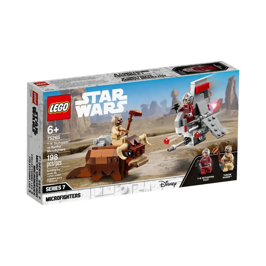 مجموعة ليغو ستار وورز 75265 تقدم معركة مصغرة بين مركبة T-16 Skyhopper وبانثا على كوكب تاتوين. تحتوي المجموعة على 198 قطعة وتستهدف الأطفال من عمر 6 سنوات فما فوق. تشمل المجموعة شخصيتين ميني فيغر: طيار T-16 Skyhopper وراكب بانثا من قبيلة التوسكن. تتميز المركبة T-16 Skyhopper بوجود مُطلقين للطوب، بينما يتميز البانثا بوجود سرج ودرع. تُعد هذه المجموعة مثالية للعب الفردي أو الجماعي، وتوفر تجربة بناء ممتعة لمحبي سلسلة ستار وورز.