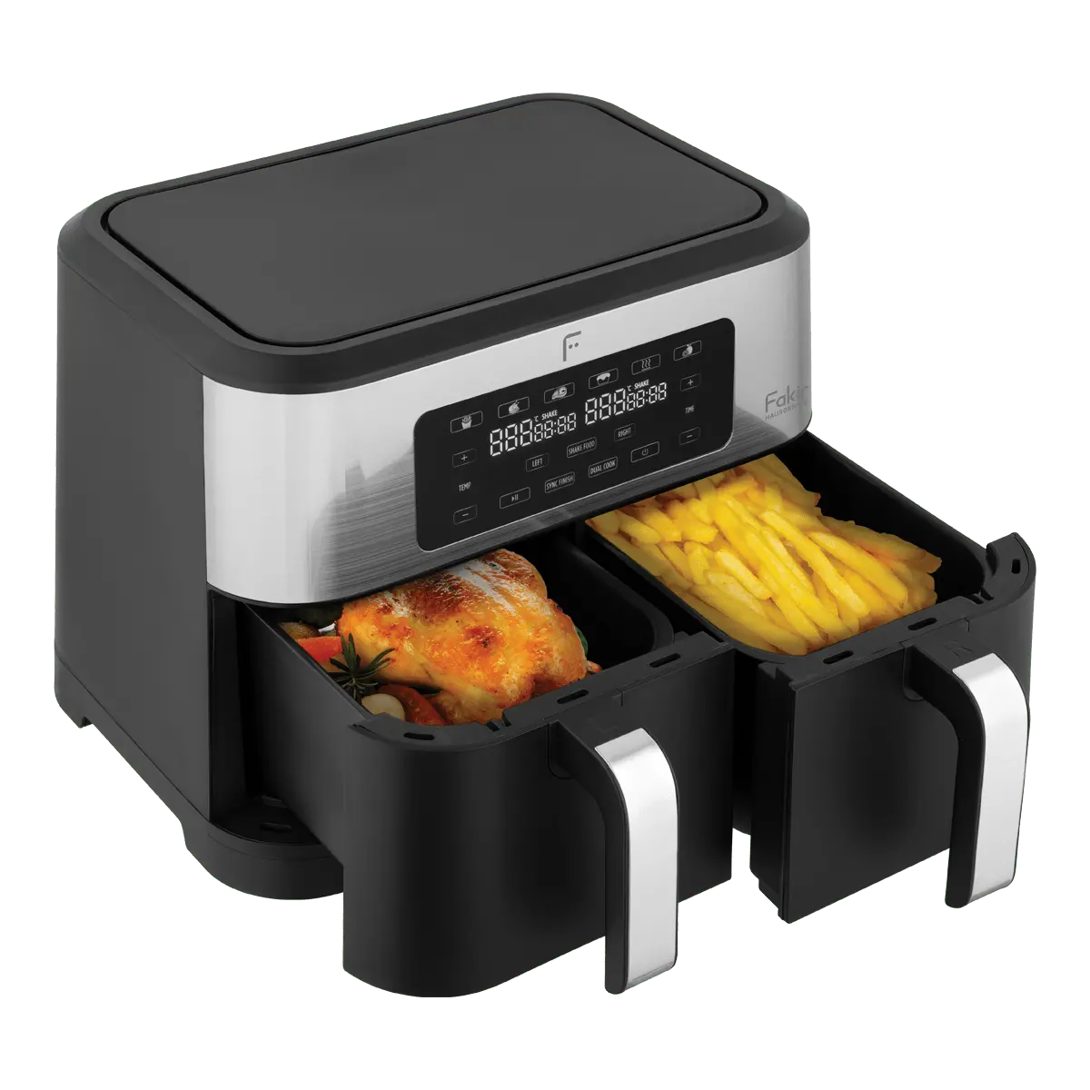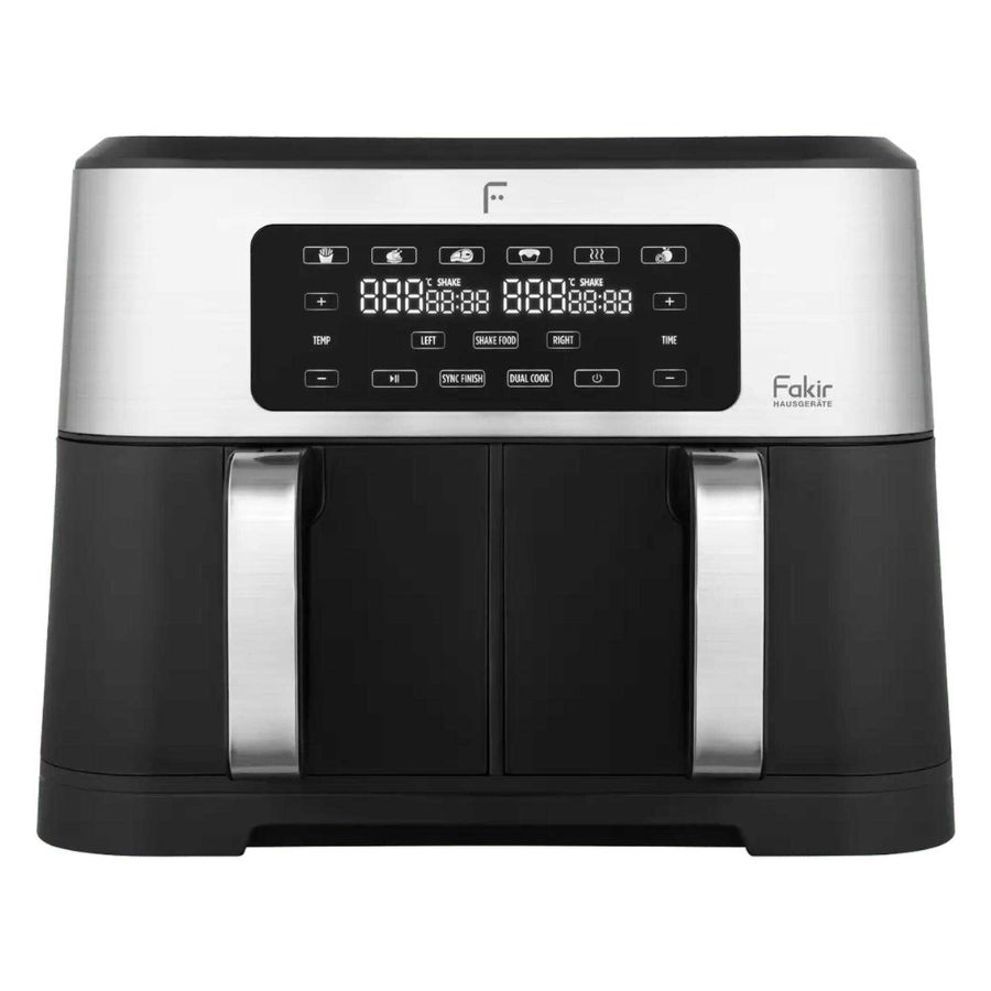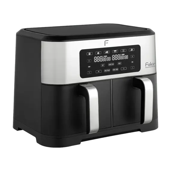 مقلاة هوائية فاكير Premium Chefry ذات سعة كبيرة وتصميم بوعائين (4.25 لتر + 4.25 لتر = 8.5 لتر) وبقدرة تشغيل تصل إلى 2800 واط، مثالية للعائلات الكبيرة أو الاستخدام المشترك. تحتوي على 6 برامج طهي مُسبقة تشمل البطاطس، الدجاج، الحلويات، الخضروات، فكّ التجميد وإعادة التسخين، مما يجعل الطهي سهلاً وسريعاً. تتيح لك التقنية الدوّامية للهواء الساخن طهي الطعام باستخدام كمية قليلة من الزيت مع نتائج مقرمشة من الخارج وطريّة من الداخل. يسمح وجود وعائين منفصلين بطهي نوعين مختلفين من الأطعمة في نفس الوقت دون تداخل النكهات. لوحة تحكم رقمية وسِلال سهلة التنظيف تُسهّلان الاستخدام والصيانة.