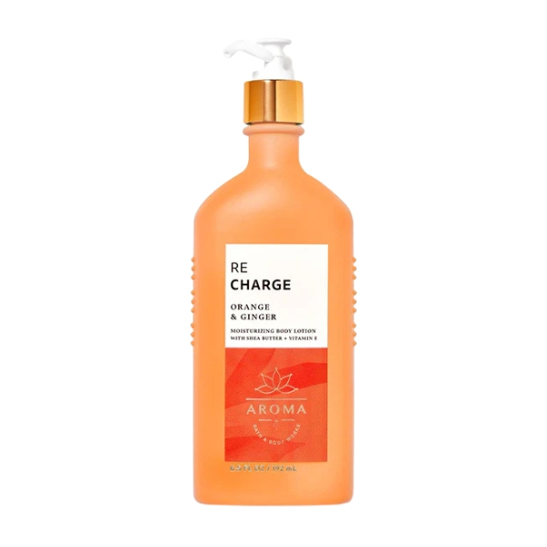 Bath & Body Works Aroma Orange & Ginger Body Lotion is an energizing, silky lotion that refreshes the skin with bright hydration, blending the vibrant zest of fresh orange with the warm, uplifting spice of ginger to create a lively, mood-boosting aroma; its lightweight texture absorbs smoothly, softening and nourishing the skin while leaving it comfortably moisturized, lightly scented, and wrapped in a clean, invigorating warmth that feels both cheerful and soothing.