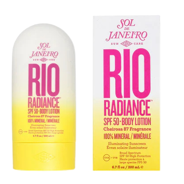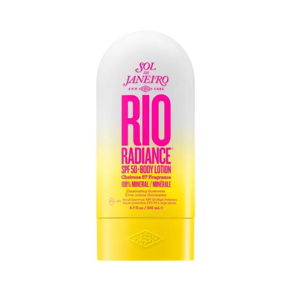 Sol De Janeiro Rio Radiance SPF 50 Body Lotion 200 ml glides over the skin with a silky, sunlit softness, blending high-protection mineral SPF 50 with comforting moisture to leave the body smooth, hydrated, and quietly glowing; enriched with cupuaçu butter, niacinamide, and antioxidant botanicals, it cushions the skin with lightweight nourishment while its warm, beach-touched Cheirosa 87 scent — a haze of creamy coconut, sun-kissed florals, and gentle vanilla — drifts over the senses like a radiant summer breeze.