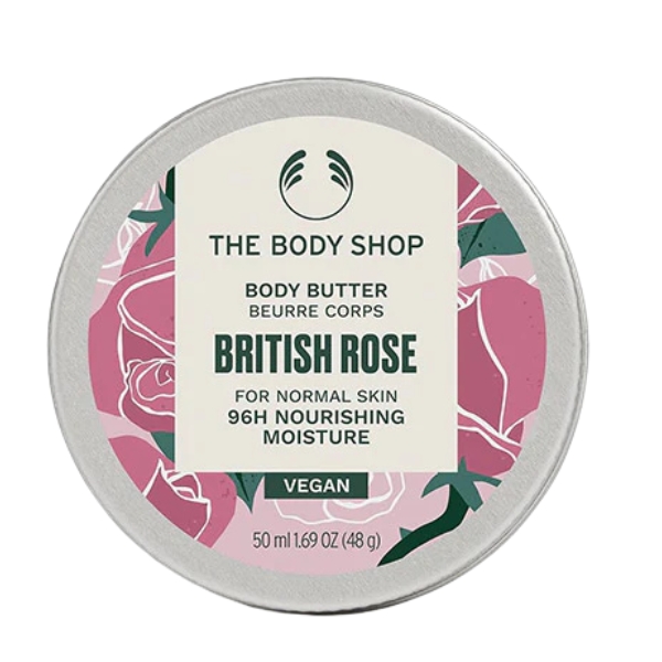 THE BODY SHOP British Rose Body Butter — a luxurious body butter that deeply nourishes and softens skin. Made with rich shea butter and cocoa butter, it melts on contact to leave skin smooth, hydrated and with a gentle, fresh rose scent. Enriched with rose extract and natural oils, it offers long-lasting moisture (up to 96 hours), giving skin a soft, velvety feel and a subtle glow. The floral aroma evokes a fresh bouquet of roses, making it perfect for daily use if you want nourished, smooth skin with a light, romantic scent.