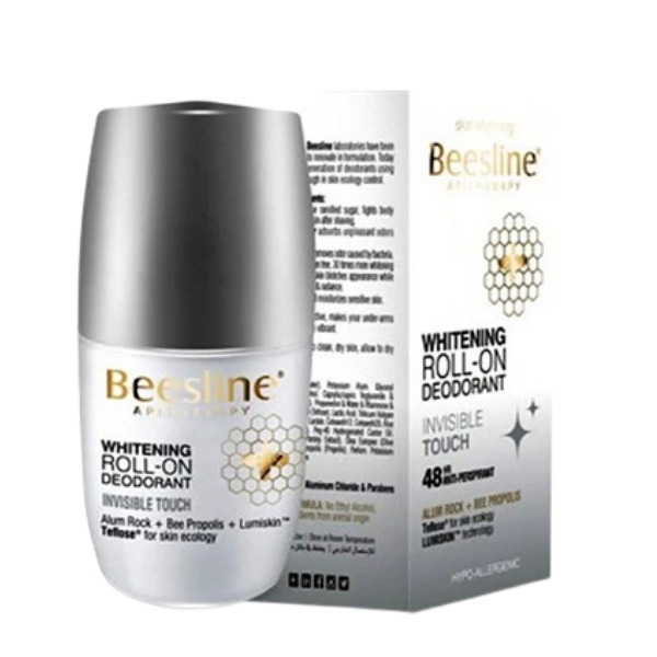 Beesline Whitening Roll-On Deodorant – Invisible Touch delivers a clean, long-lasting freshness with a lightweight formula that glides smoothly onto the skin, helping reduce the appearance of underarm darkness while keeping the area dry and comfortable; its gentle, alcohol-free blend absorbs quickly without leaving stains or residue, leaving the underarms feeling soft, even-toned, and naturally refreshed with a subtle, clean scent that lasts throughout the day.