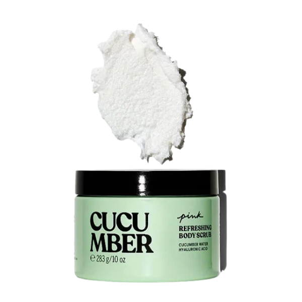 VICTORIA'S SECRET PINK REFRESHING BODY SCRUB CUCUMBER envelops the skin in a crisp, cooling freshness as its gentle scrub particles softly polish away dullness, melting into a light, hydrating texture infused with the clean, watery brightness of cucumber; with each sweep, it leaves the skin feeling smoother, revived, and lightly refreshed, carrying a cool, green aroma that evokes pure clarity and comfort, creating an exfoliating experience that feels airy, uplifting, and naturally energizing.