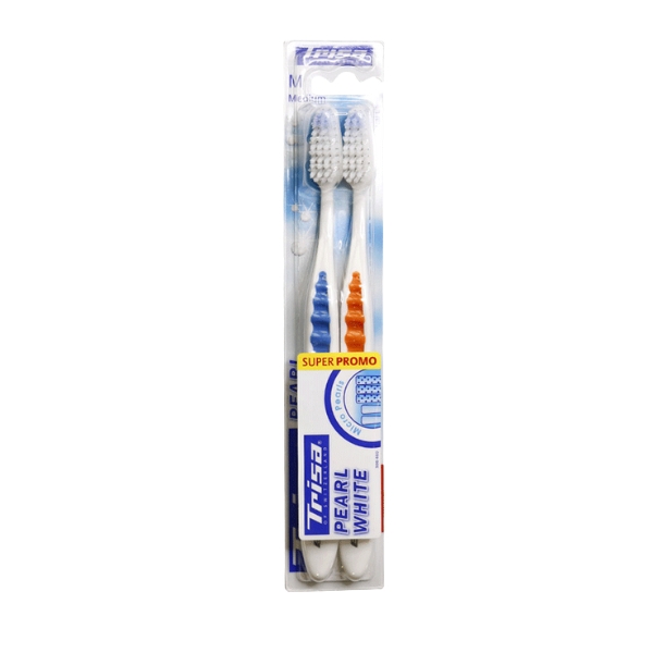 Trisa ToothB Pearl White Duo Medium is a practical duo toothbrush set designed for balanced daily oral care, featuring medium bristles that effectively remove plaque while staying comfortable on teeth and gums, with precisely shaped brush heads and elegant ergonomic handles for controlled, confident brushing.