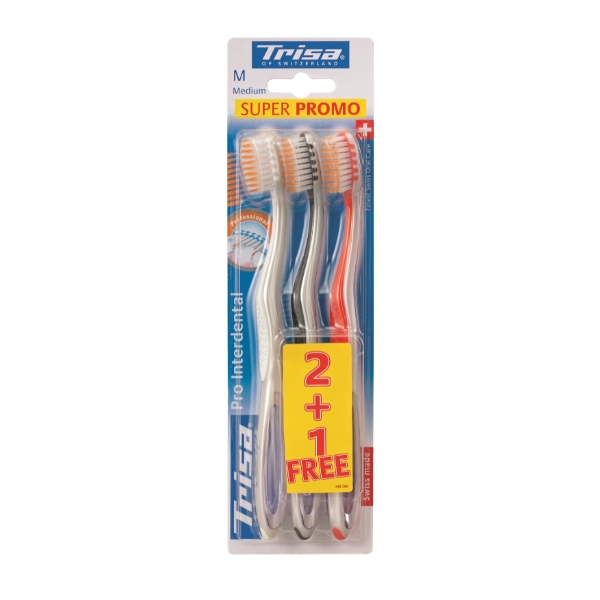 Trisa ToothB Pro Interdental Medium TRIO is a triple-pack of specialized interdental toothbrushes with medium bristles designed to effectively clean between teeth and along the gumline, helping remove plaque and debris from tight spaces while offering comfortable, reliable daily care for a healthier, fresher mouth.
