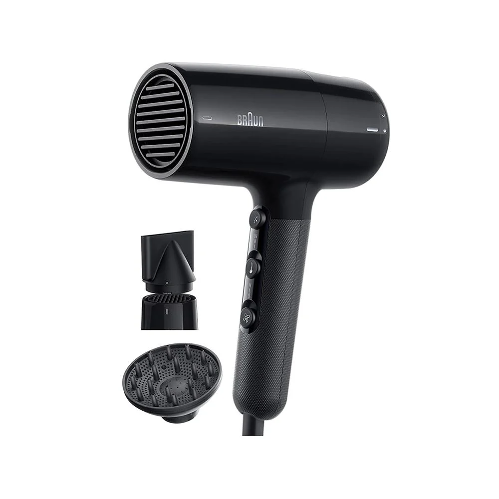 The Braun Ionic Hair Dryer HD2.2 delivers salon-quality results with its powerful 2200W motor, offering fast and efficient drying while protecting your hair’s natural shine. The advanced ionic technology reduces frizz and enhances smoothness, giving you sleek, manageable hair every day. With three airflow settings—High, Medium, and Low—you can easily control the airflow to suit different hair types and styling needs. It comes with a diffuser for added volume and curl definition, and a focus nozzle for precise drying. Lightweight, ergonomic, and stylishly designed in black, this dryer offers comfort, durability, and reliable German-engineered performance.