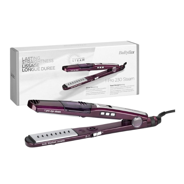 The BaByliss I-Pro 230 Steam Hair Straightener with Shine Technology for Ultimate Straightening is a professional-grade styling tool designed to deliver salon-quality smoothness, shine, and long-lasting results. Equipped with advanced steam technology, it releases a gentle flow of steam to relax hair fibers for faster and more effective straightening while maintaining natural moisture and preventing dryness. Its titanium-ceramic coated plates ensure even heat distribution and a smooth glide through the hair, while the ionic technology helps reduce frizz and static for a glossy, polished finish. With multiple adjustable temperature settings up to 230°C and customizable steam levels, it caters to all hair types—from fine and delicate to thick and curly. The straightener also features a removable comb, a digital temperature display, and a swivel cord for easy styling, along with an auto shut-off function for added safety. Combining powerful performance with innovative shine-enhancing steam technology, the BaByliss I-Pro 230 Steam Hair Straightener offers effortless, long-lasting straightening with superior softness and radiance.