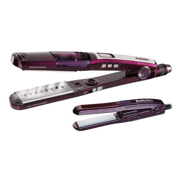 The BaByliss ST396ALE iPro 230 Steam Wet and Dry Hair Straightener 230°C, Titanium Ceramic and Mini Straightener is a professional-quality styling set designed to deliver smooth, shiny, and long-lasting results. The main straightener features titanium-ceramic coated plates for even heat distribution and effortless glide, along with an integrated steam function that hydrates and protects the hair during styling, reducing frizz and enhancing shine. With five adjustable temperature settings from 170°C to 230°C, it ensures precise control for every hair type, whether fine or thick. Its wet and dry functionality allows safe use on both damp and dry hair, while the ionic technology helps eliminate static for a sleek, polished finish. The set also includes a mini straightener, perfect for touch-ups, travel, or styling shorter hair, offering convenience and professional performance in one complete package.
