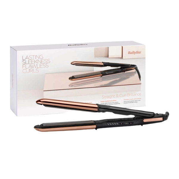 The BaByliss Straight & Curl Brilliance Hair Iron is a versatile 2-in-1 styling tool designed to deliver salon-quality smooth straightening and effortless curls with one device, thanks to its polished titanium-coated plates and rounded stainless-steel outer housing. It features five precision heat settings ranging from 150 °C to 235 °C for customised results across different hair types, heats up in just 15 seconds, and incorporates ionic anti-frizz technology to leave hair sleek, shiny and static-free. With extra-long plates, a curved housing for wrap-around curls, a 3 m swivel cord, and a cool-tip design for safer use, this Straight & Curl Brilliance hair iron offers both efficiency and style in one tool.