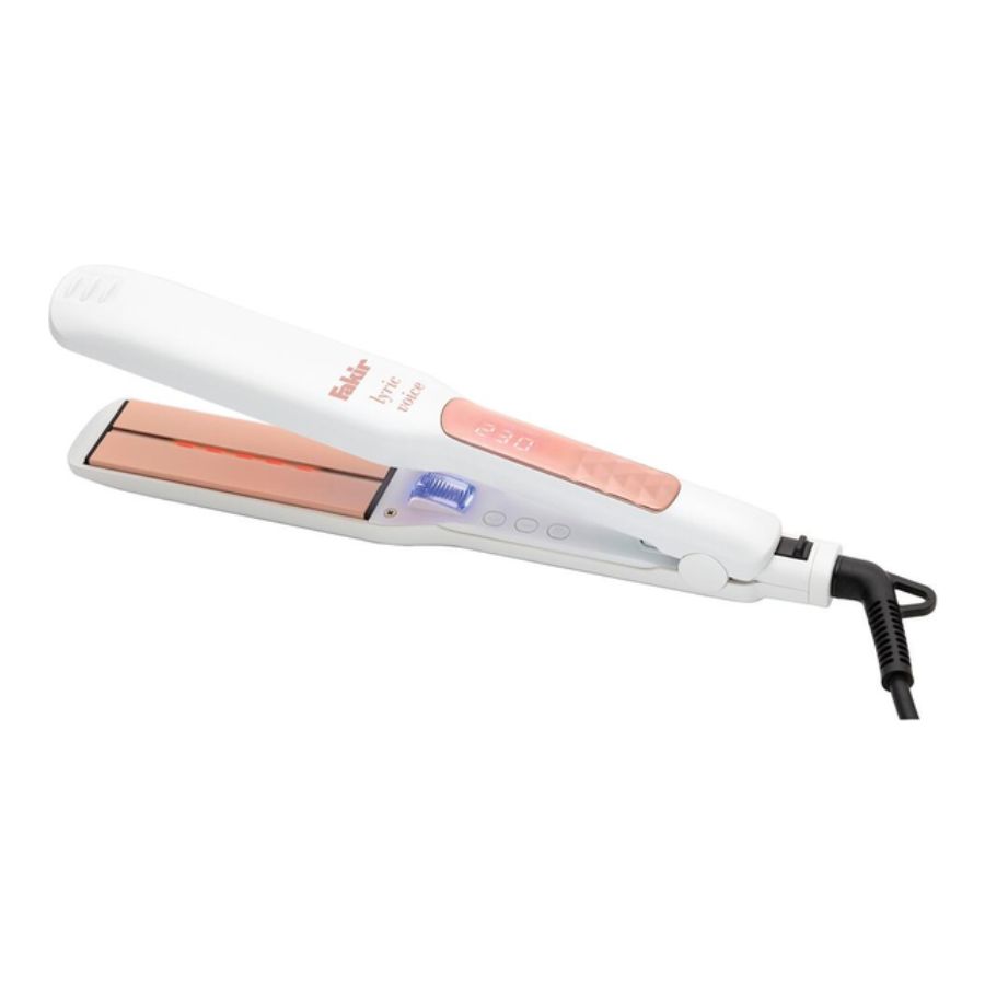 The FAKIR LyricVoice Hair Straightener – White is a premium styling tool designed to deliver smooth, sleek results with advanced technology. It features tourmaline‑ceramic coated plates infused with keratin for enhanced glide and reduced hair damage, along with infrared heating and ionisation functions to minimise frizz and protect hair integrity. With LED temperature display and six heat settings ranging from 100 °C to 230 °C, it adapts to various hair types and styles. The device also includes a 360° swivel cord for flexibility, plate locking mechanism for safe storage, and automatic shutdown after 60 minutes for peace of mind. Elegant in white finish, it’s ideal for home use or travel.