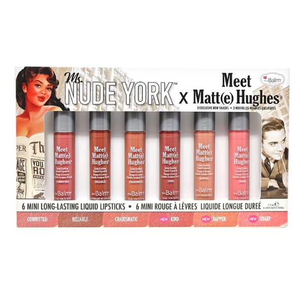 The Balm – Meet Matt(e) Hughes Set (Miss Nude York) offers a collection of long lasting liquid lipsticks with a smooth, comfortable matte finish. Each shade provides rich pigmentation that stays put without drying out the lips. The lightweight formula glides on easily and delivers a refreshing, mint vanilla scent. Perfect for everyday wear, this set enhances your look with natural, flattering nude tones.