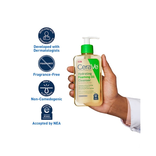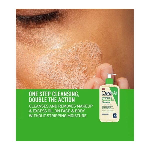 The CeraVe Hydrating Foaming Oil Cleanser is a unique, non-stripping cleanser that begins with a silky oil texture and transforms into a soft, airy foam upon contact with water. Formulated with a blend of marula and sunflower oils, it effectively dissolves makeup, sunscreen, and excess sebum while replenishing the skin with essential lipids. Enriched with CeraVe's cornerstone ingredients—three essential ceramides, hyaluronic acid, and niacinamide—it works to cleanse while helping to restore and maintain the skin's natural protective barrier. This results in skin that feels thoroughly purified yet exceptionally soft, smooth, and hydrated, making it an ideal choice for normal to very dry or sensitive skin types that require deep cleansing without any compromise to moisture levels.