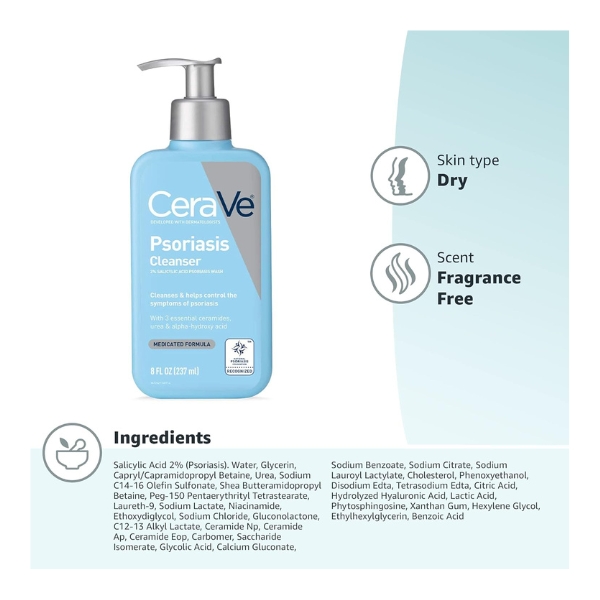 The CeraVe Psoriasis Cleanser is a therapeutic body wash formulated to actively manage the flaking, scaling, and redness associated with psoriasis. Its core active is 2% salicylic acid, a keratolytic agent that penetrates thickened skin to effectively soften and remove excess scales and plaques. The formula is further enhanced with CeraVe's cornerstone blend of three essential ceramides to help repair the skin's compromised barrier, licorice root extract to soothe irritation, and hyaluronic acid to provide lasting hydration. This gentle, fragrance-free cleanser works to smooth skin texture, relieve itching, and improve the overall appearance of psoriasis-affected skin without causing further dryness or discomfort.