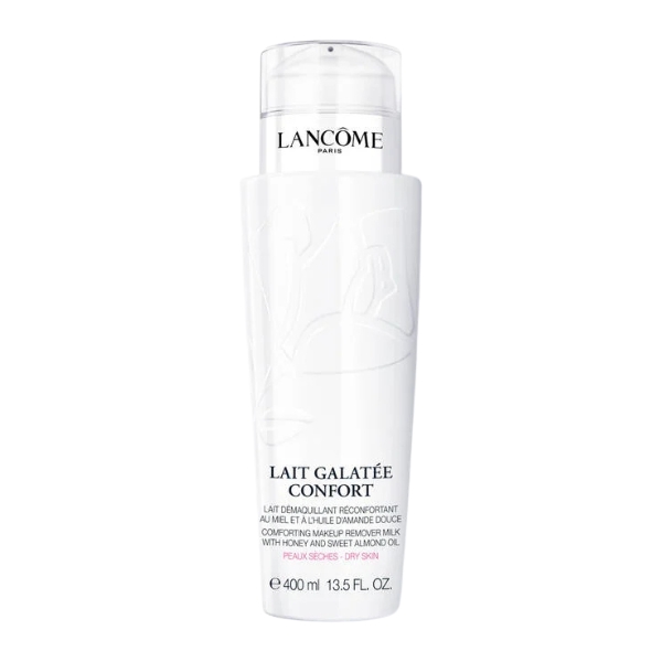 The Lancome Galatee Comfort Make Up Remover Milk is a rich, creamy cleansing milk specifically formulated for dry and sensitive skin. Its ultra-gentle, emollient-rich texture effortlessly dissolves all traces of makeup, including waterproof formulas, and impurities without the need for harsh rubbing. Enriched with a blend of soft conditioning agents and Lancôme's signature honey and acacia ingredients, it soothes and comforts the skin while helping to reinforce its natural hydrolipidic barrier. This non-rinse formula leaves the skin feeling impeccably clean, incredibly soft, supple, and comforted, with no greasy residue or feeling of tightness.