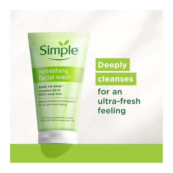 The Simple Refreshing Facial Wash is a gentle, gel-based cleanser designed to effectively cleanse while being kind to sensitive skin. Its soap-free and pH-balanced formula contains pro-Vitamin B5 and Vitamin E to help maintain skin's natural moisture barrier during cleansing. True to the Simple brand ethos, it contains no artificial perfumes, colors, or harsh irritants, making it a trustworthy option for even the most delicate skin types. It works to lift away dirt, oil, and impurities without leaving the skin feeling tight, stripped, or dry, resulting in a clean, soft, and refreshed complexion.