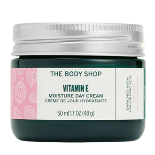 THE BODY SHOP Vitamin E Moisture Day Cream is a lightweight, fast-absorbing face moisturizer designed to make your skin feel softer, smoother, and more hydrated. Enriched with natural-origin hyaluronic acid and vitamin E—as well as raspberry seed oil—the cream helps skin retain moisture, boosting hydration even 8 hours after application and helping skin look healthy and plump for up to 48 hours.