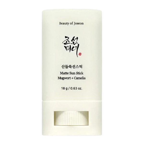 The Beauty of Joseon Matte Sun Stick: Mugwort + Camellia SPF50+ PA++++ is a portable, solid-format sunscreen designed to provide high SPF50+ PA++++ protection with a weightless, velvety finish. Its key ingredients include Mugwort Extract, known for its soothing and anti-inflammatory properties to calm the skin, and Camellia Sinensis Leaf Extract, a rich source of antioxidants. The stick glides on smoothly without tugging, creating a transparent, non-greasy layer that effectively mattifies shine and blurs the appearance of pores. This makes it an ideal product for quick, mess-free reapplication over makeup or on bare skin throughout the day, offering convenient sun care for oily and combination skin types.