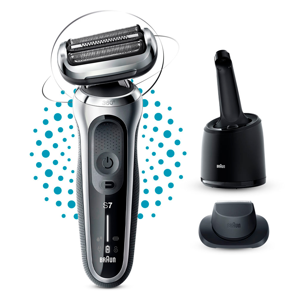 The Braun 71-S7200CC is a premium electric shaver from the Series 7 line, designed to provide a close and comfortable shave. Its 360° Flex head adapts to your facial contours, ensuring maximum contact and a smoother shave, even in tricky areas. The AutoSense technology reads and adapts power to your beard density, capturing and cutting more hair in every shave. The shaver is 100% waterproof, allowing for use in the shower or with shaving foam. It comes with a 4-in-1 SmartCare Center that cleans, charges, and lubricates the shaver for optimal performance. The Li-Ion battery provides up to 3 weeks of shaving on a full charge, with a 5-minute quick charge sufficient for one full shave.