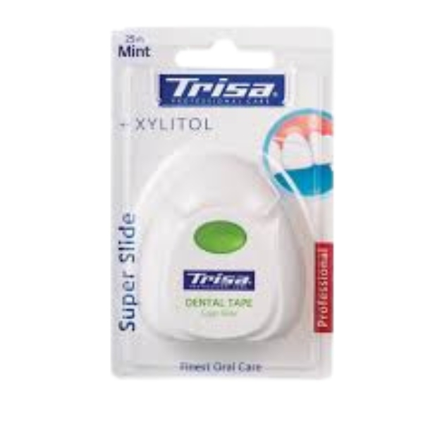 Trisa Dental Floss Super Slide mint,xylitol,25m is an ultra-smooth dental floss designed to slide effortlessly between even tightly spaced teeth, helping to remove plaque and trapped food particles with minimal resistance; enriched with refreshing mint flavor and xylitol to support fresh breath and daily oral hygiene, its gentle yet effective texture ensures comfortable use without irritation, while the 25-meter length offers convenient, reliable care for a clean, healthy-feeling mouth.