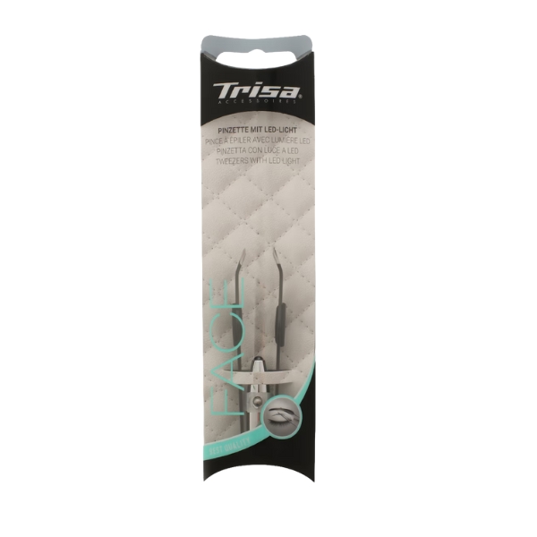 Trisa tweezer with LED light form is a precision grooming tool equipped with a built-in LED light that illuminates the area for enhanced visibility, allowing accurate hair removal and detailed shaping even for fine or hard-to-see hairs; its precisely aligned tips ensure a firm grip and controlled handling, delivering clean, neat results with added convenience and confidence.
