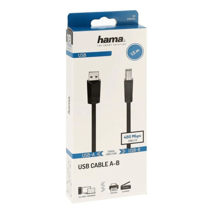 The Hama 1.5 m USB 2.0 USB-A to USB-B Cable (200602) is a reliable and high-quality connection solution for linking devices such as printers, scanners, and external hard drives to your computer. Supporting USB 2.0 speeds of up to 480 Mbps, it ensures fast and stable data transfer. The cable features gold-plated connectors for improved conductivity and reduced signal loss, while its durable construction resists bending and wear. With a 1.5-meter length, it offers flexibility and convenience in any setup, making it perfect for both home and office use.