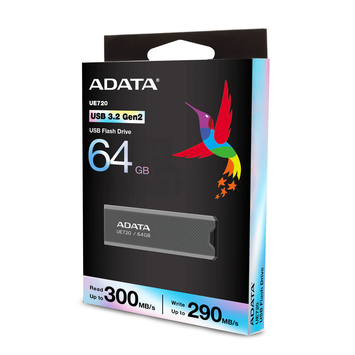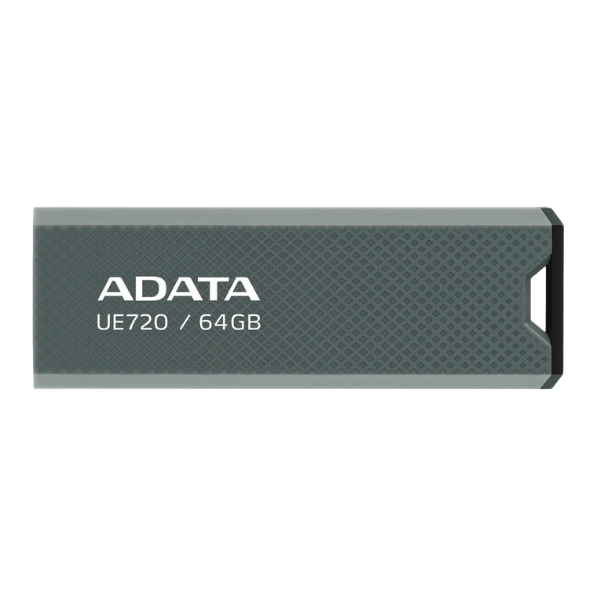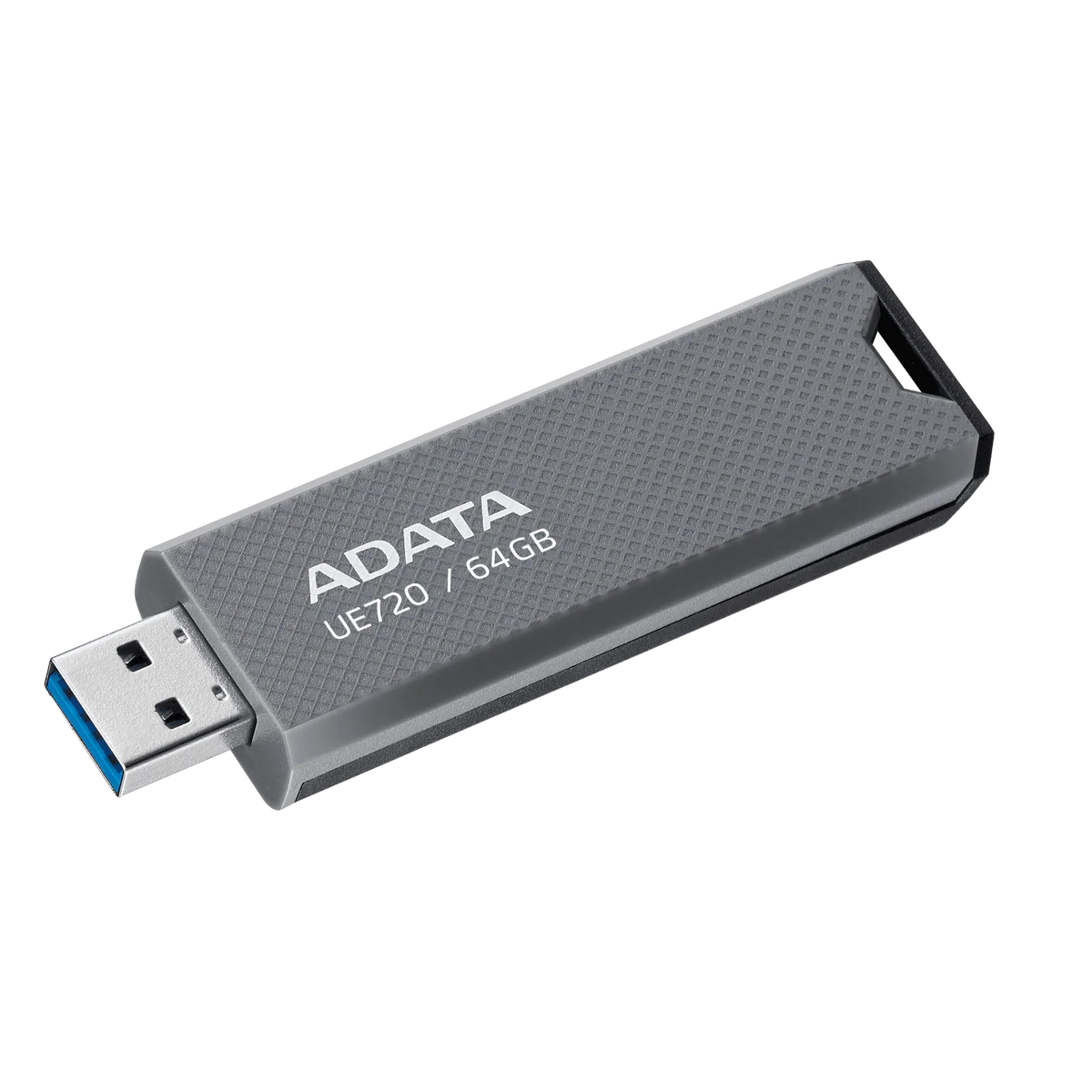 The ADATA UE720 USB 3.2 Gen 2 Flash Drive offers high-speed data transfer with up to 10 Gbps connectivity and read/write speeds of 550/450 MB/s, making it ideal for quick file transfers, multimedia storage, and on-the-go use. Its capless slide design ensures convenience and portability, while the sleek gray finish adds a modern, stylish look. With 64GB of storage, it provides ample space for documents, photos, videos, and applications.