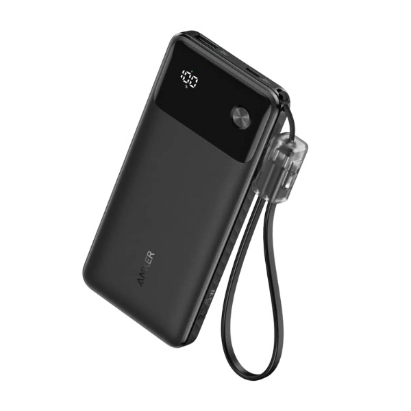 The Anker Power Bank 10K mAh 22.5 W with USB‑C Cable (Black) is a slim, shoulder-ready companion that eliminates cable clutter and delivers fast charging where you need it. The built-in USB‑C cable and additional USB‑C and USB‑A ports each support up to 22.5 W Power Delivery—enough to quickly top up modern smartphones, tablets, and earbuds. Its intelligent color display provides real-time battery level and charging status, while multi-device support lets you charge up to three gadgets at once. Lightweight yet robust, with trickle mode for low-power accessories and a neat lanyard cable design, it makes a reliable everyday power solution.