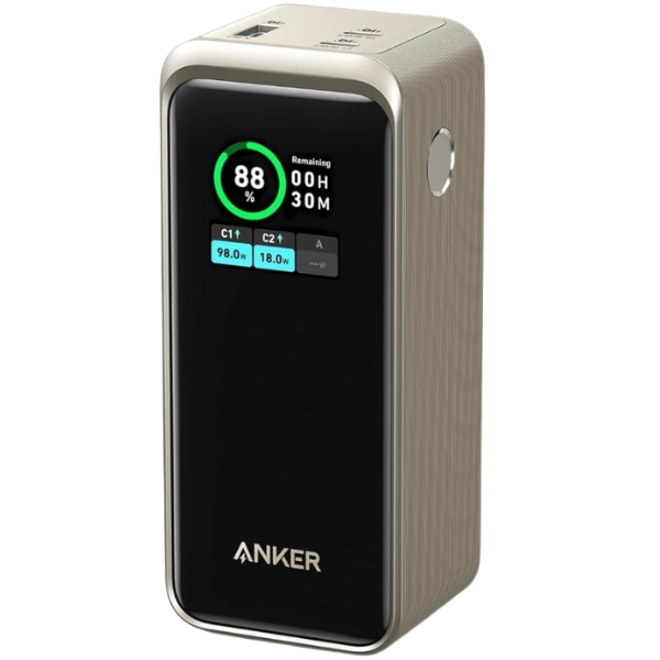 The Anker Prime 20,000mAh 200W Power Bank is a high capacity portable charger with two USB-C and one USB-A ports, delivering fast charging for multiple devices simultaneously. It supports 100W fast recharge and features a compact design with a smart display showing real time battery status.