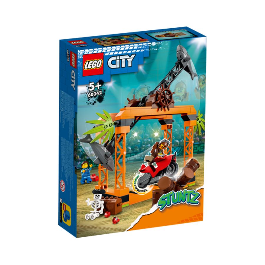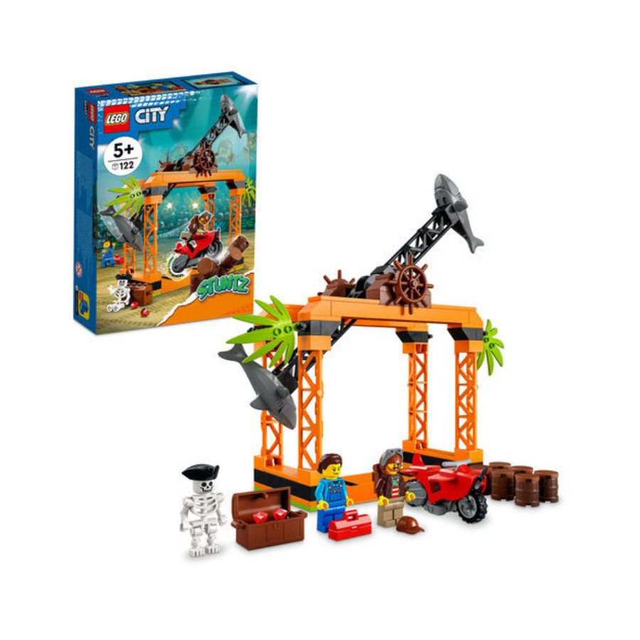 The LEGO City The Shark Attack Stunt Challenge 60342 is an action-packed playset designed for young thrill-seekers. This 122-piece set, suitable for children aged 5 and up, features a flywheel-powered stunt bike, a spinning shark wheel, barrels, and a hidden pirate treasure chest. The set includes two minifigures: Chuck D. Goldberg from LEGO City Adventures and a mechanic. Kids can launch the stunt bike to perform daring feats, avoiding obstacles and aiming to strike the barrels to reveal the treasure. The set encourages imaginative play and enhances fine motor skills.