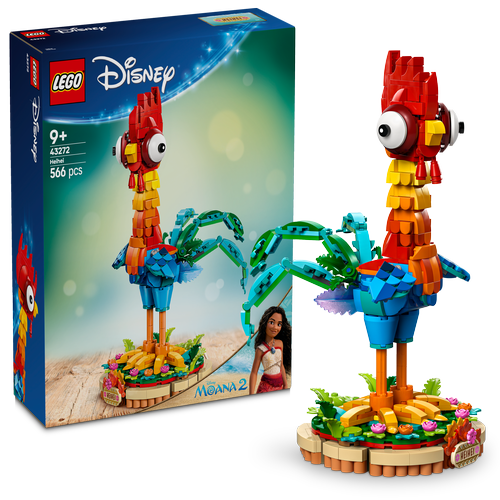 The LEGO Disney Heihei 43272 set allows fans aged 9 and up to build a posable model of Heihei, the colorful rooster from Disney’s Moana and Moana 2. This 566-piece set features a rotating head, posable wings, and tail feathers, allowing for various display poses. The set includes a decorative stand with flowers and a nameplate for display purposes. Heihei stands over 10.5 inches (27 cm) tall when fully assembled.