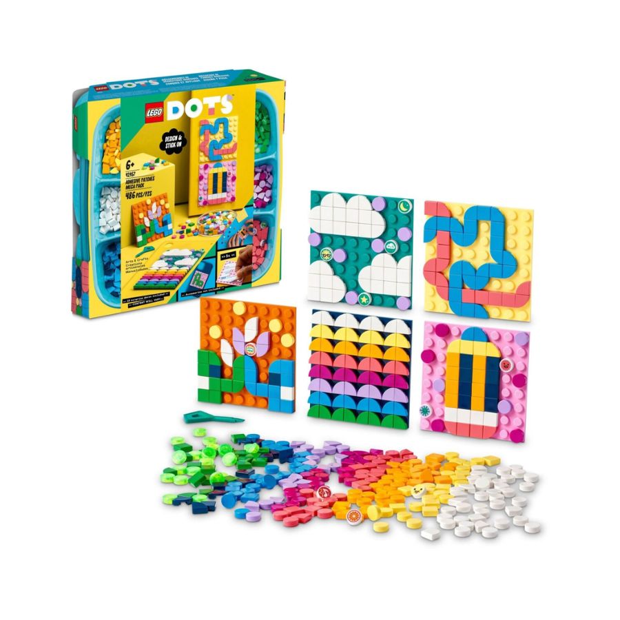 The LEGO DOTS set 41957 is a creative craft kit designed for children aged 6 and up, comprising approximately 486 pieces. It features five 8×8 adhesive patches suitable for sticking to any hard surface, and over 450 colorful tiles including 10 specially decorated ones The set encourages artistic expression by allowing builders to create and redesign personal designs, promoting creativity and fine-motor skill development.
