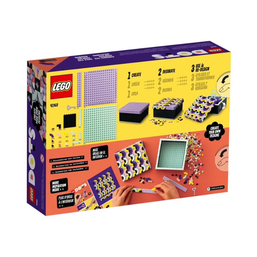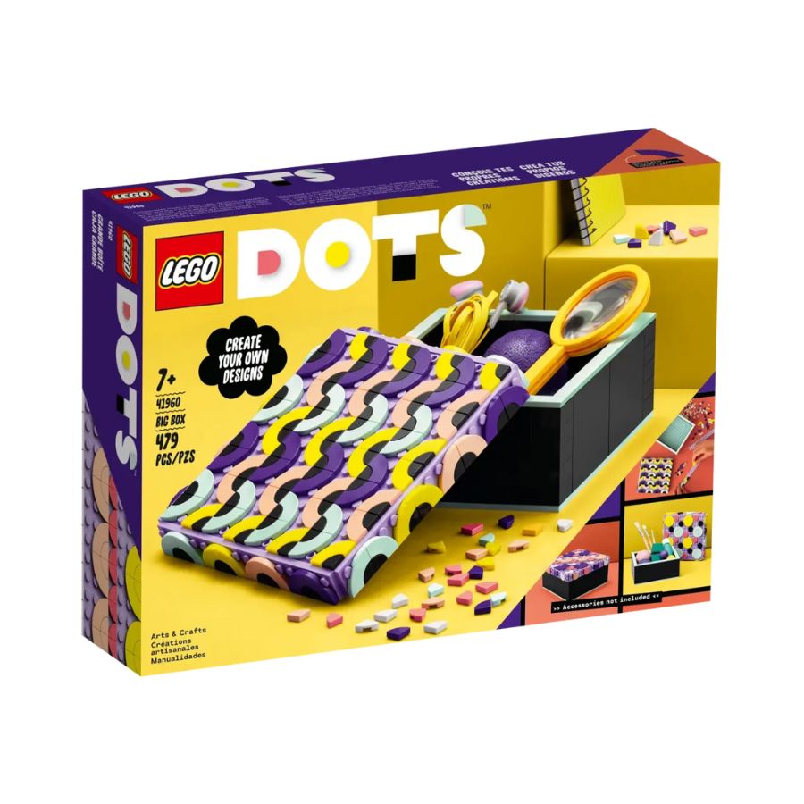 The LEGO DOTS 41960 Big Box set is designed for children aged 7 and up and contains 479 pieces for creative designs. The set includes square and curved tiles in pastel and neon colours, and a removable lid that can be decorated as desired. The box can be used to store jewelry, desk items, or as a photo holder, with the lid easily redesignable. This set promotes creativity and personal expression while developing hand-eye coordination, allowing children to customize and rearrange the pieces continuously for a fun and evolving building experience.