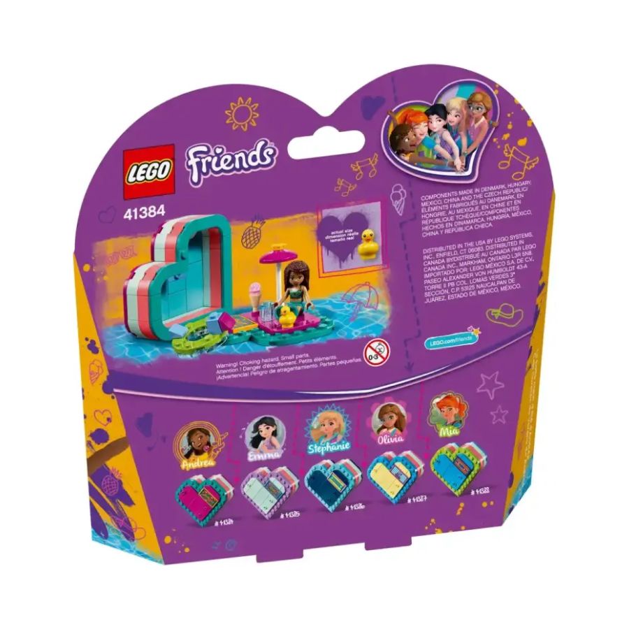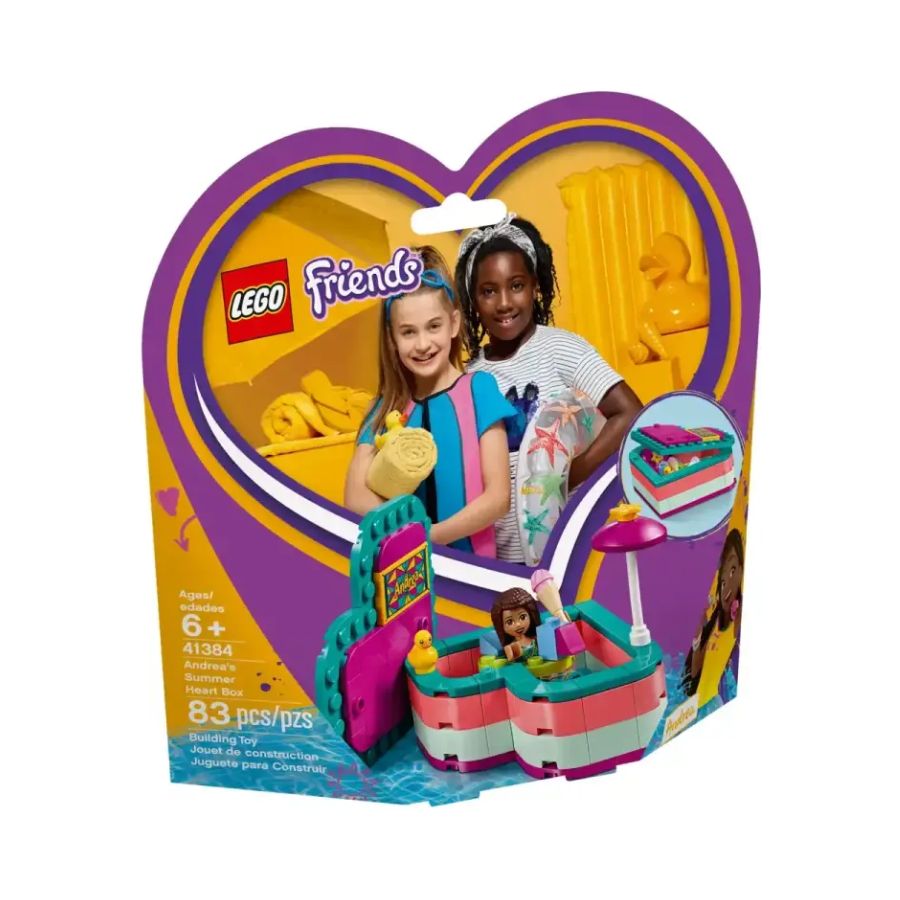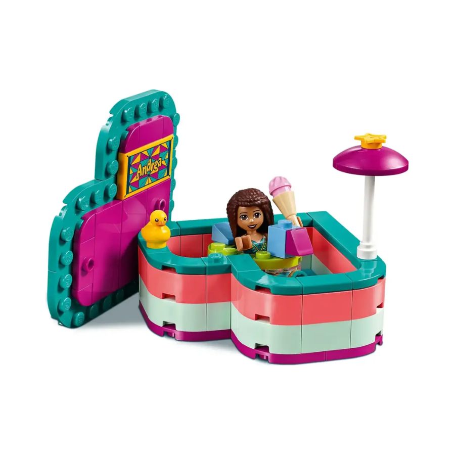 LEGO Friends Andreas Summer Heart Box 41384 is a compact and portable playset for kids aged 6+, featuring 43 pieces. This set includes a mini-doll figure of Andrea, a dog figure, a buildable beach scene, a sandy play area, a heart-shaped frame, and fun accessories for interactive storytelling. All pieces attach securely to the heart-shaped box base, allowing children to play anywhere. When finished, the box folds neatly for storage or travel. This set encourages creativity, imaginative play, and problem-solving skills, making it perfect for young LEGO and summer adventure enthusiasts.