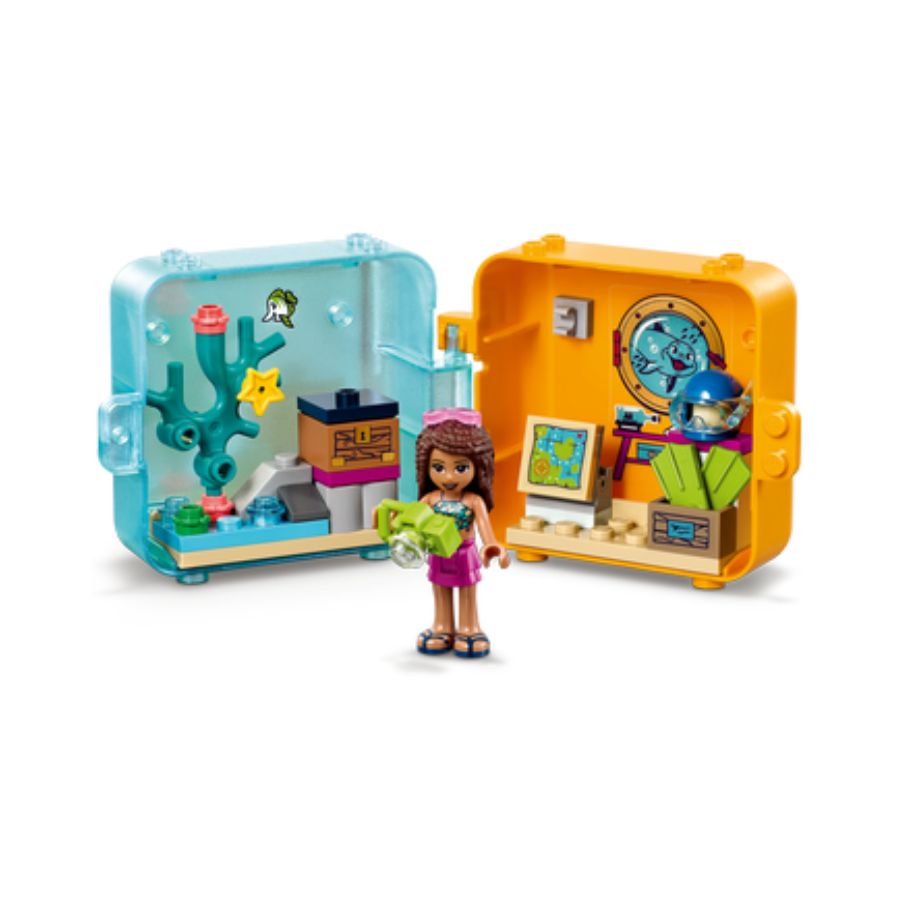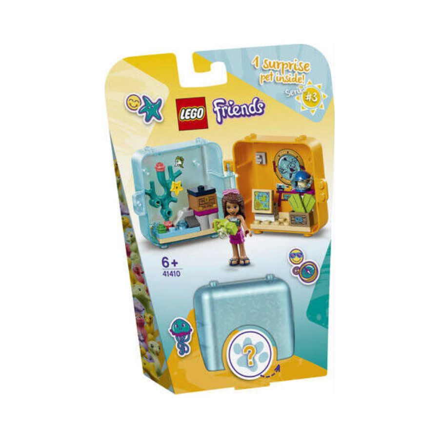 LEGO Friends Andreas Summer Play Cube 41410 is a compact and portable playset for kids aged 6+, featuring 56 pieces. This set includes a mini-doll figure of Andrea, a dog figure, a buildable beach scene, a sandy play area, a sailboat, a trophy, and various fun accessories for interactive storytelling. All pieces securely attach to the cube base, allowing children to play anywhere. When finished, the cube folds neatly for storage or travel. This set encourages creativity, imaginative play, and problem-solving skills, making it perfect for young LEGO and summer adventure enthusiasts.