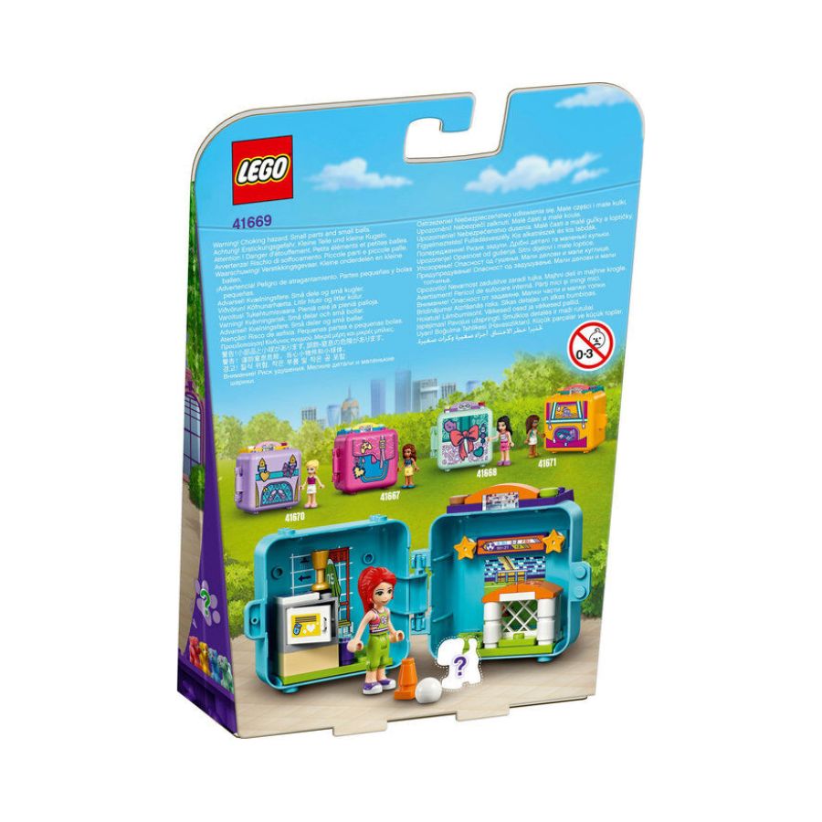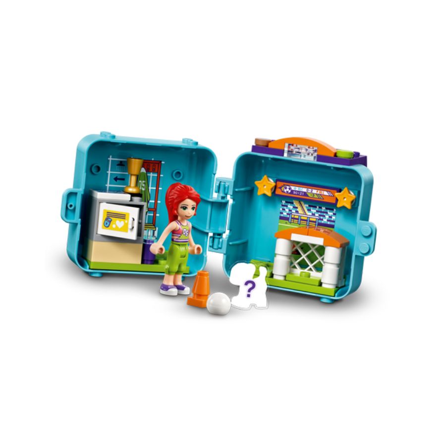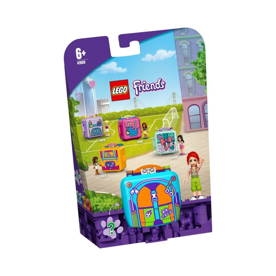 LEGO Friends Mia's Soccer Cube (41669) is a compact and portable playset for kids aged 6+, featuring 56 pieces. Designed to resemble a sports bag, this cube includes a Mia mini-doll figure, a dog toy in a surprise color, a buildable goal, a locker room, a scoreboard, a soccer ball, and a trophy. The pieces attach securely to the base, allowing for on-the-go play. When finished, all components neatly pack away into the cube, making it perfect for travel or school recess fun. Ideal for young soccer enthusiasts and LEGO fans alike.