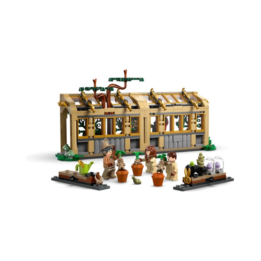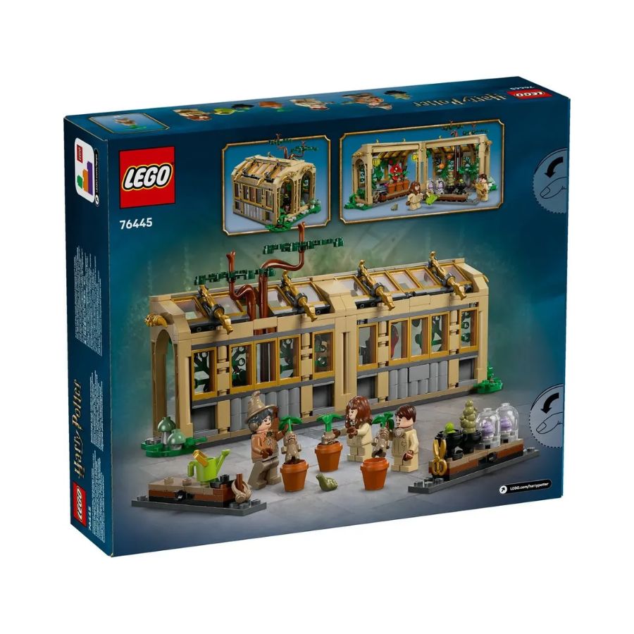 LEGO Harry Potter Hogwarts™ Castle: Herbology Class 76445 is an engaging set for fans aged 8+, featuring 390 pieces. This set includes a buildable greenhouse classroom with opening sides for easy play access. It comes with three minifigures: Professor Sprout, Hermione Granger, and Neville Longbottom, along with Trevor the toad. The greenhouse is equipped with two removable tables filled with magical plants, including three specially designed Mandrakes that can be held by the minifigures. The set also features a tree growing through a broken window and various gardening accessories, allowing for immersive role-play experiences.
