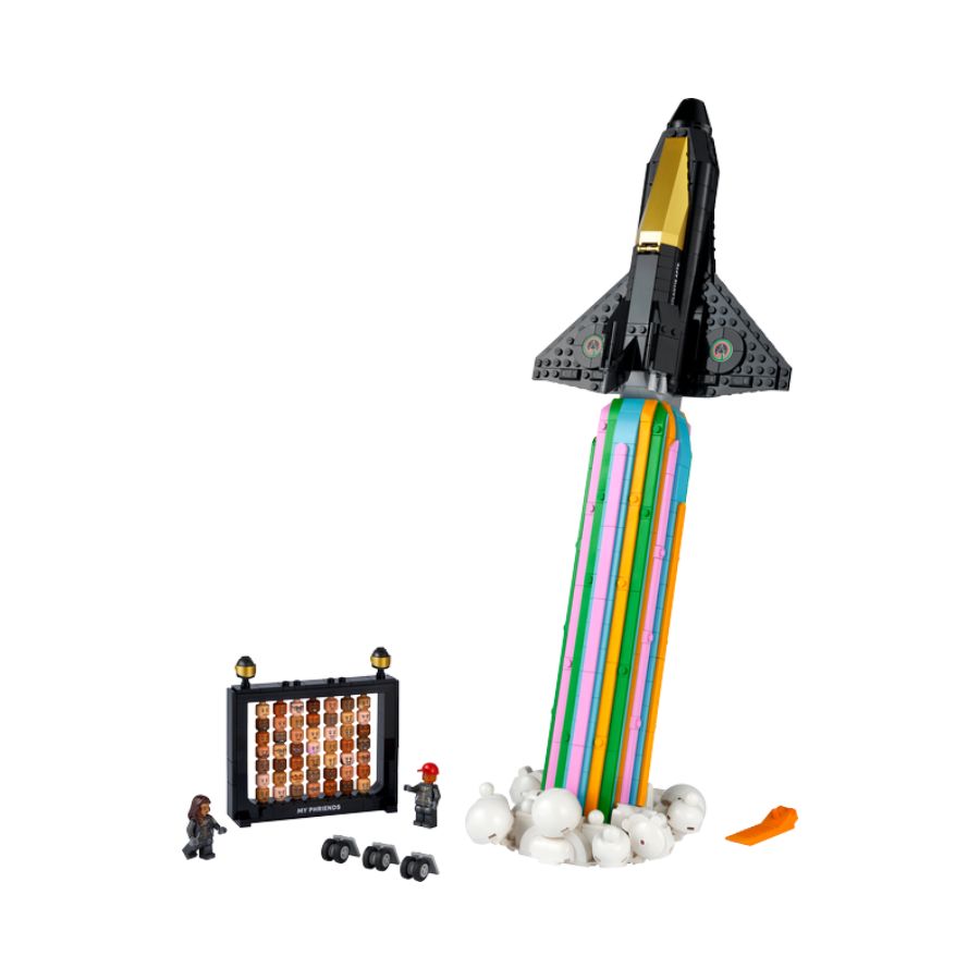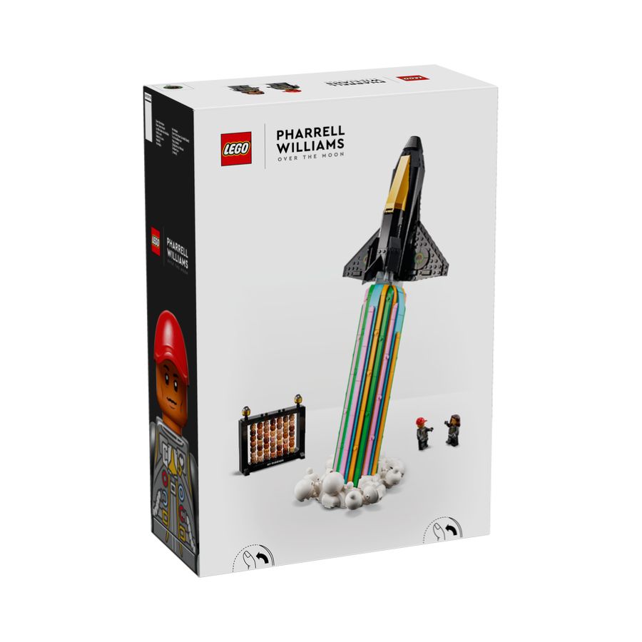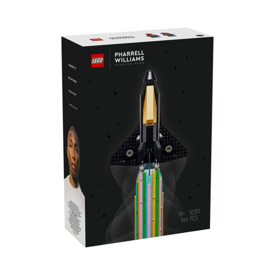 LEGO Icons Over the Moon with Pharrell Williams 10391 is a collaborative set designed in partnership with Pharrell Williams, comprising 966 pieces. This imaginative model features a sleek black-and-gold space shuttle launching into the cosmos, propelled by a vibrant, multicolored jet stream. The set includes Pharrell Williams and Helen Lasichanh minifigures, each adorned in titanium-colored space suits with gold-tinted visors. A standout feature is the abacus-like display stand, showcasing 49 interchangeable LEGO minifigure heads, symbolizing diverse human expressions and creativity. Released on September 20, 2024, this set celebrates imagination and the limitless potential of space exploration.