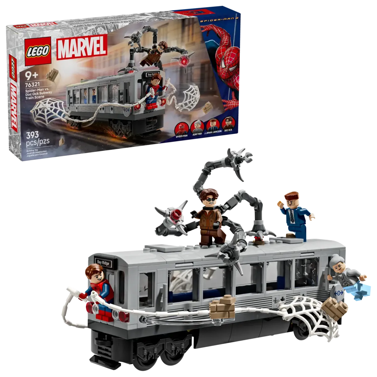 The LEGO Marvel Spider-Man vs. Doc Ock Subway Train Scene 76321 set is designed for children aged 9 and up. It features 393 pieces and allows builders to recreate the iconic subway train rescue from Marvel Studios' Spider-Man 2. The set includes four minifigures: Spider-Man with interchangeable masked and unmasked heads, Doc Ock with four jointed tentacles (two with laser beams and two with clips that attach to the train), J. Jonah Jameson, and Aunt May. The buildable subway train features removable roof sections revealing passenger seating for minifigures, and Spider-Man can use his attachable web to stop the runaway train while Doc Ock's mechanical tentacles create authentic action play. The set also offers an immersive digital construction experience through the LEGO Builder app.