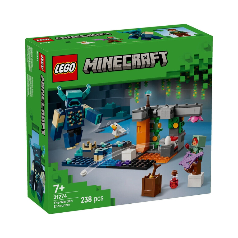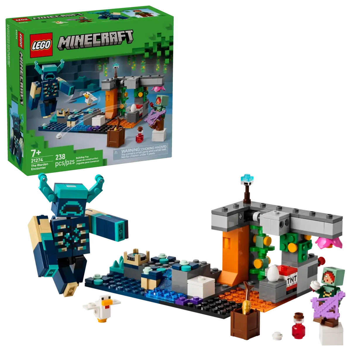 The LEGO Minecraft The Warden Encounter 21274 set offers an action‑packed cave adventure for children aged 7 and up. With 238 pieces, the set features a large poseable Warden figure with movable head, arms and legs, a cave environment with hidden diamonds and amethysts, a TNT‑trigger function to blast through rock, and a falling rock hazard element for added excitement. Accessories include a Silent Ranger minifigure and a chicken mob, encouraging storytelling, imaginative play and dynamic build action.