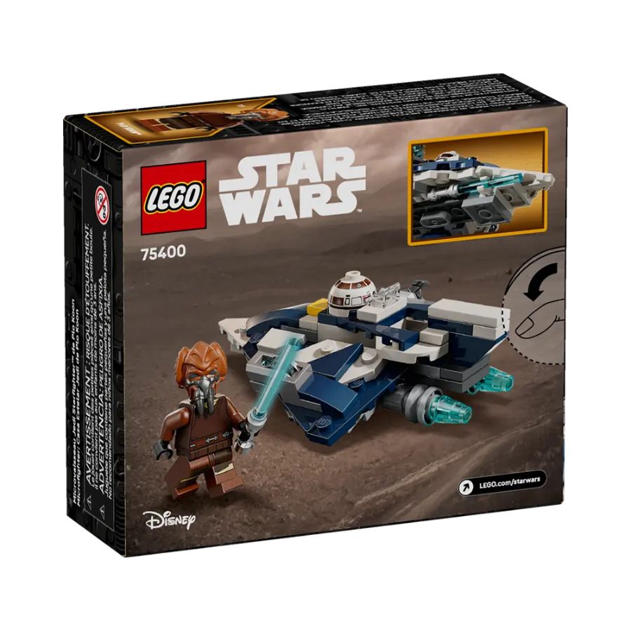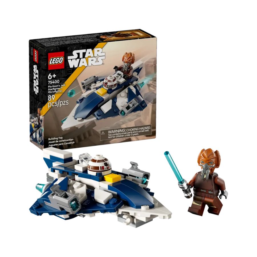 The LEGO Star Wars set 75400 offers a compact Microfighter version of Jedi Master Plo Koon’s starfighter, featuring 89 pieces. It includes a cockpit to place the Plo Koon minifigure, and an R7-D4 droid head element at the front of the ship. Designed for a quick build,it's suitable for kids aged 6 and up, and comes with two stud-shooters to recreate space battle action. It’s a great addition for Star Wars fans looking to expand their Microfighter collection or start a display of small builds.