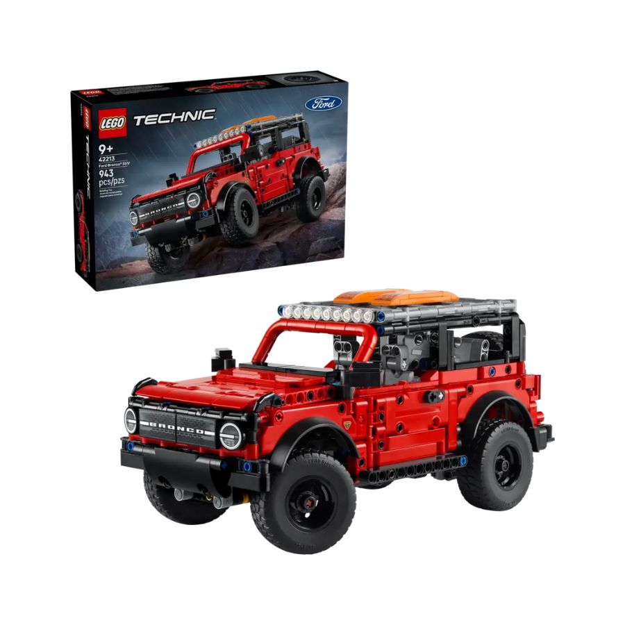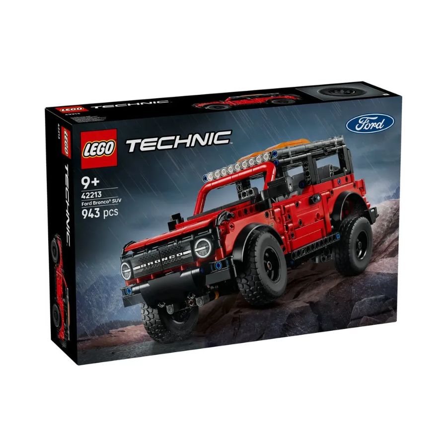 LEGO Technic 42213 is an accurate model of the Ford Bronco® SUV, combining bold design with advanced engineering. The set includes 943 pieces and features a V6 engine with moving pistons, independent suspension, functional steering, and opening doors. It also includes working front and rear lights, adding realism to the model. The distinctive red and black colors give it a sleek sporty appearance. This set is suitable for children aged 9 and above and makes a perfect addition to any LEGO collection or for fans of sports cars.